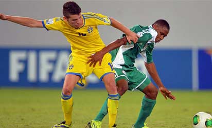FILE PHOTO: Musa Yahaya challenges for the ball with Erdal Rakip of Sweden during the FIFA U17 group F match between Sweden and Nigeria at Khalifa Bin Zayed Stadium on October 22, 2013 in Al Ain, United Arab Emirates. (Photo by FIFA)